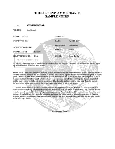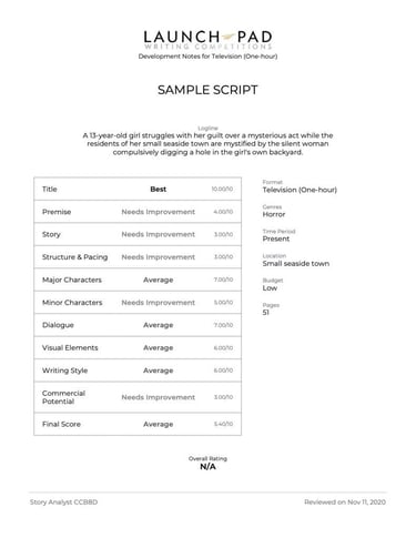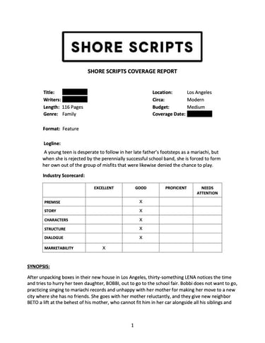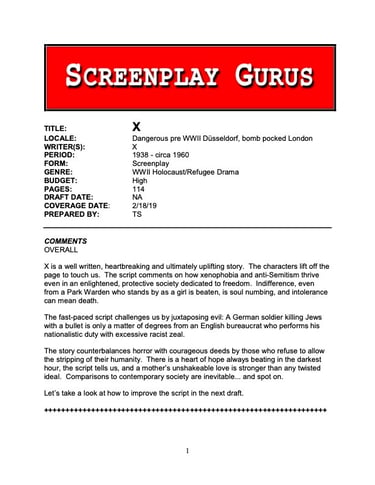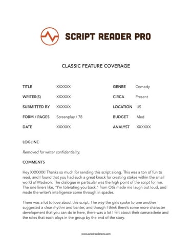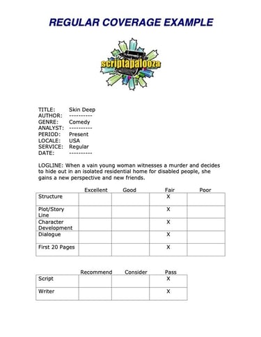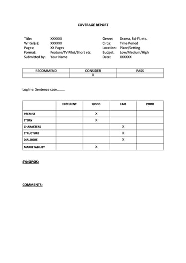 Coverage reports come in all different shapes and sizes, and there's no official industry standard layout to adhere to. Most coverage services should offer a sample of what a writer can expect when purchasing coverage, and they'll also provide new readers on their roster with a template of their own individual report style from which to use.